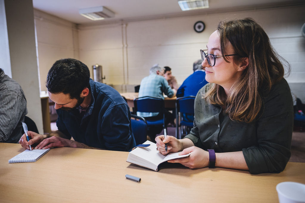 Cereal grower Richard Heady and beef and sheep farmer Rachael Madeley-Davies writing down story ideas related to their farms during the topline exercise.